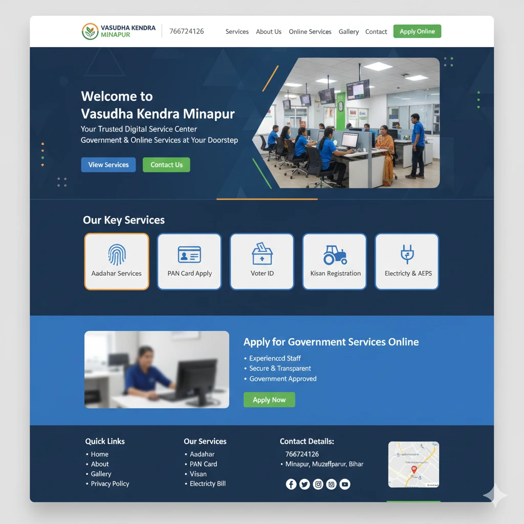 वसुधा केंद्र मीनापुर एक विश्वसनीय, प्रमाणित एवं जन-हितैषी डिजिटल सेवा केंद्र है, जिसका उद्देश्य आम नागरिकों तक सरकारी एवं ऑनलाइन सेवाओं को सरल, तेज और पारदर्शी तरीके से पहुँचाना है। आज के डिजिटल युग में जहाँ अधिकांश सरकारी प्रक्रियाएँ ऑनलाइन हो चुकी हैं, वहीं ग्रामीण एवं अर्ध-शहरी क्षेत्रों के लोगों को सही मार्गदर्शन और सुविधा की आवश्यकता होती है। इसी उद्देश्य के साथ वसुधा केंद्र मीनापुर की स्थापना की गई, ताकि हर व्यक्ति को एक ही स्थान पर सभी आवश्यक डिजिटल सेवाएँ उपलब्ध हो सकें।